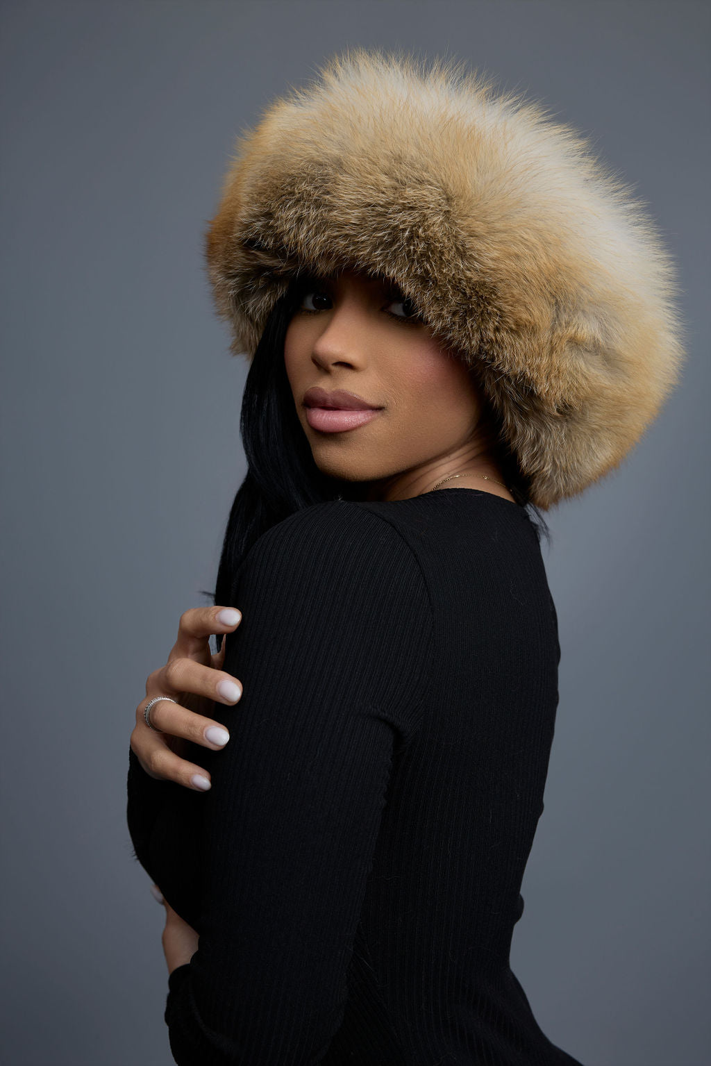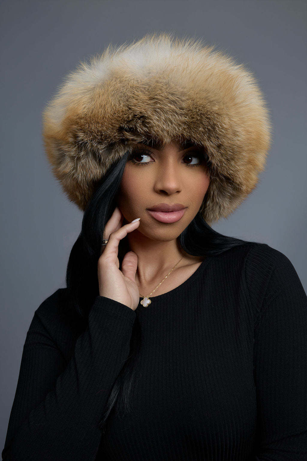 Women's Natalia Leather And Fox Russian Hat [Black/Gold]
