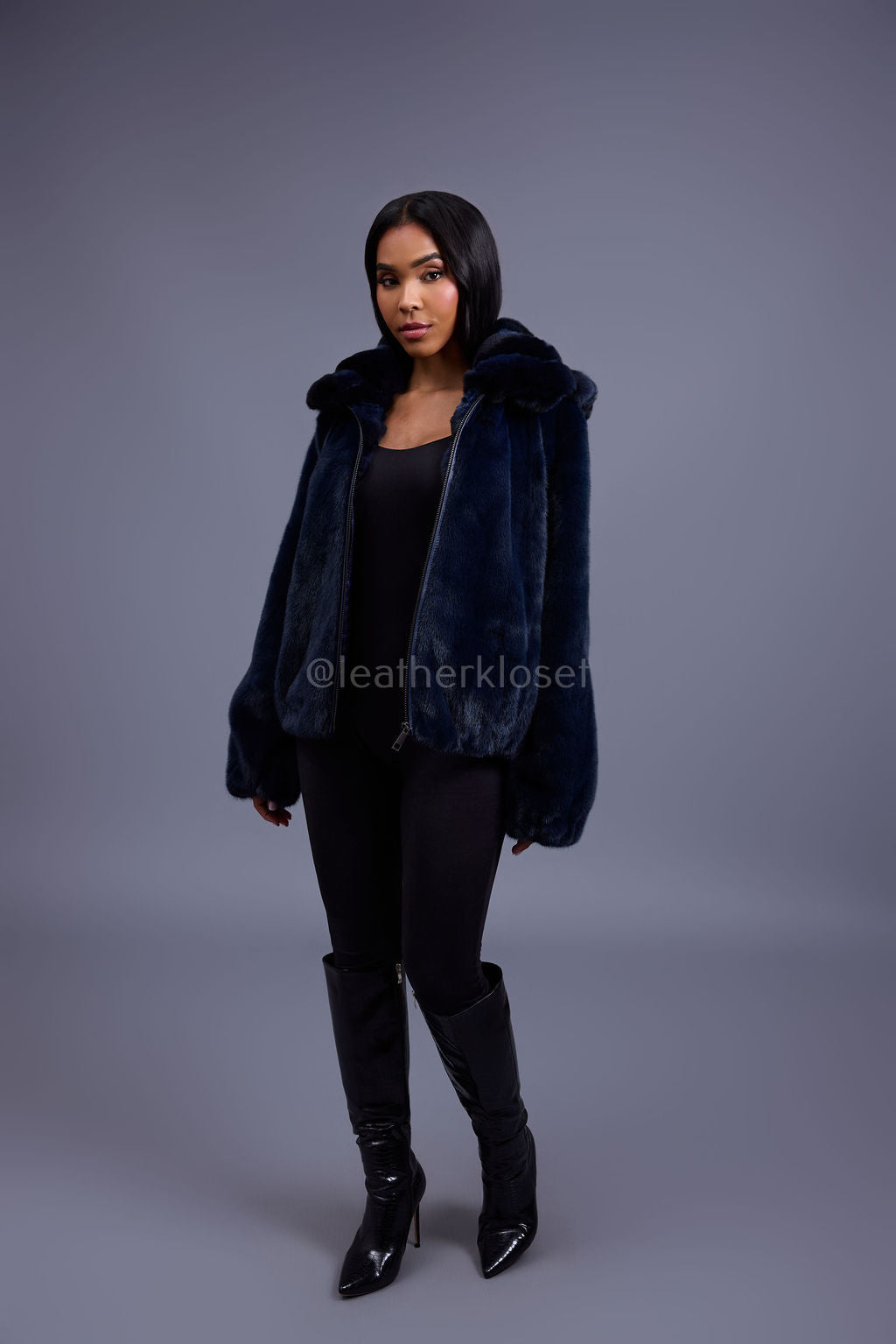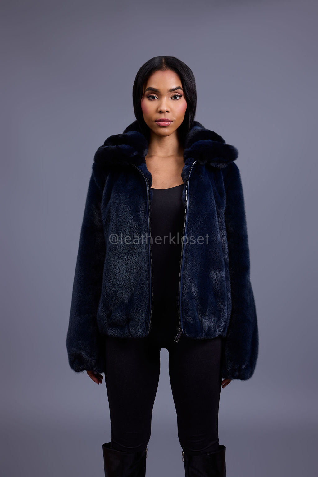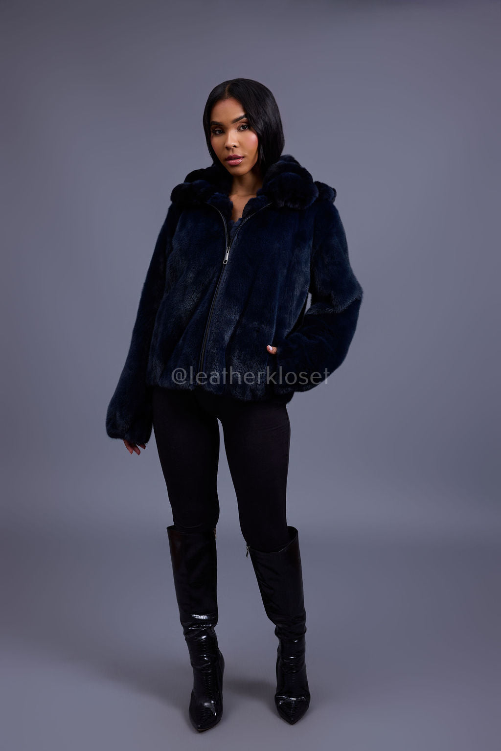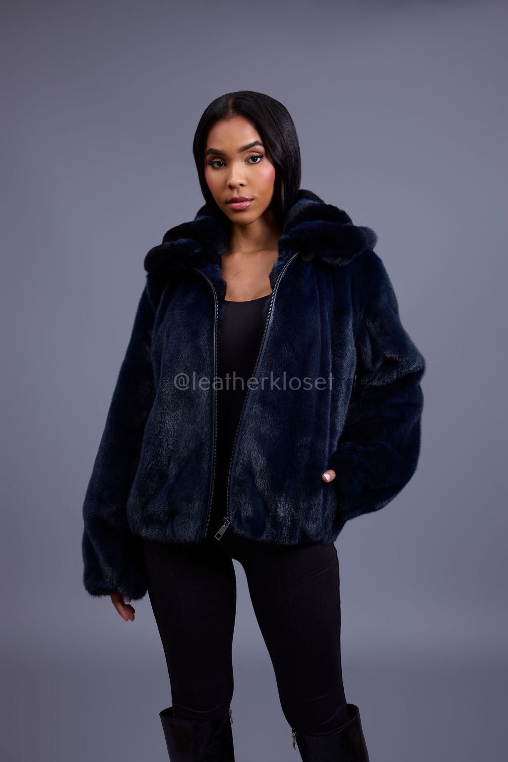 Women's Mink Bomber With Chinchilla Collar And Hood [Navy]