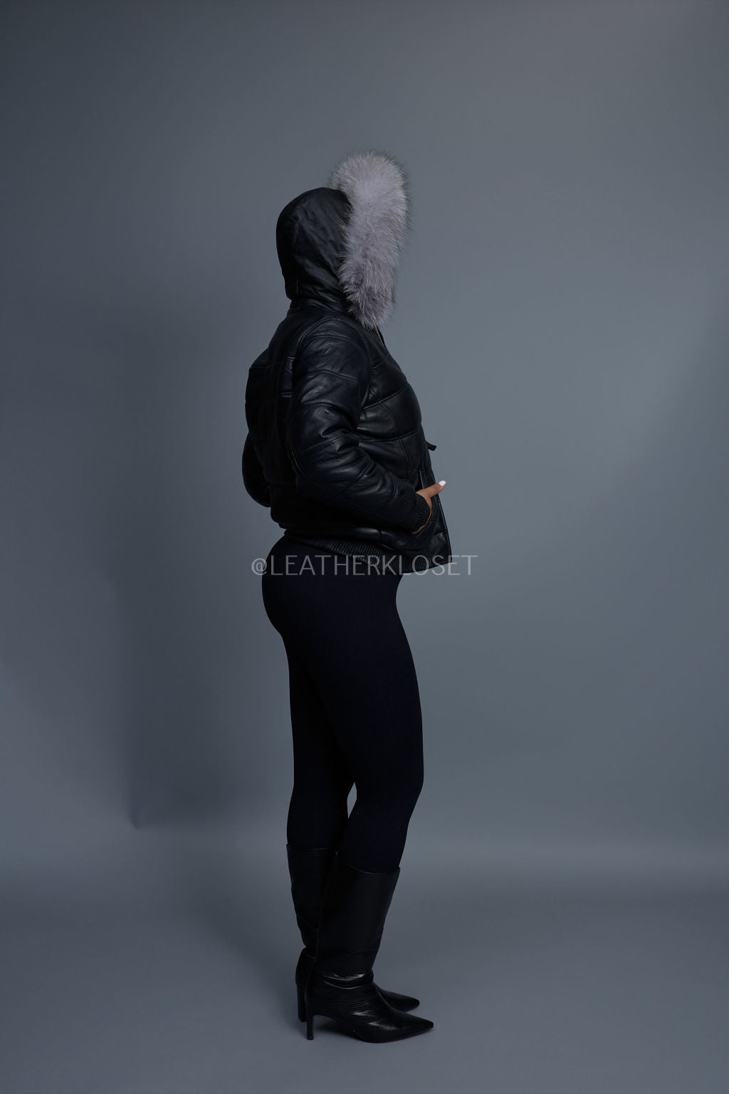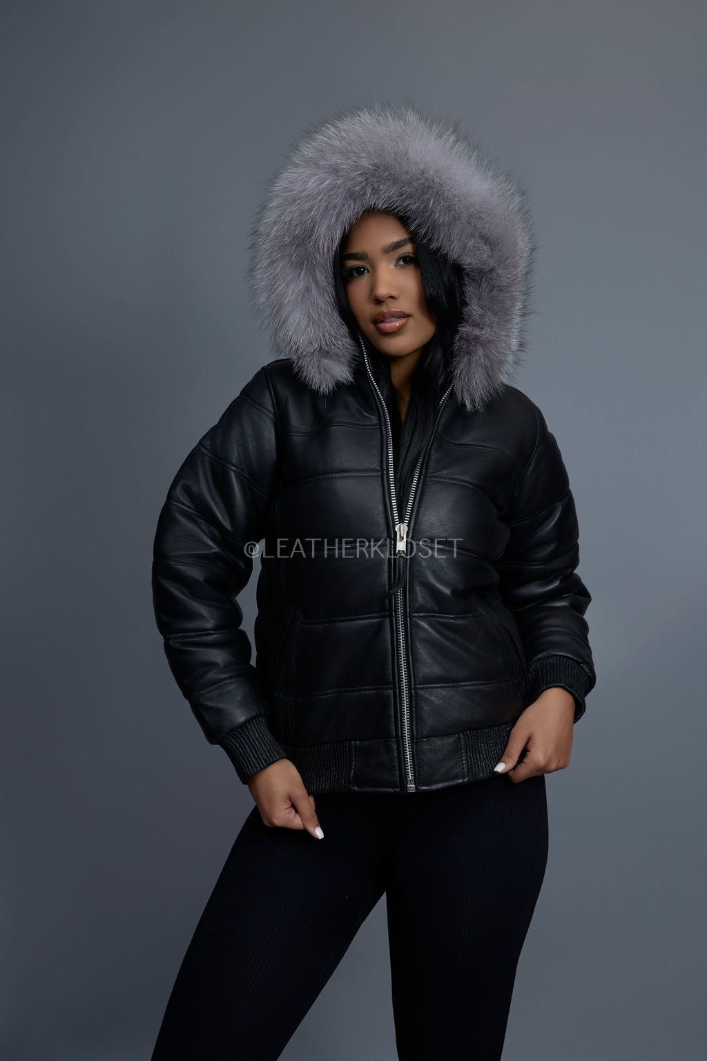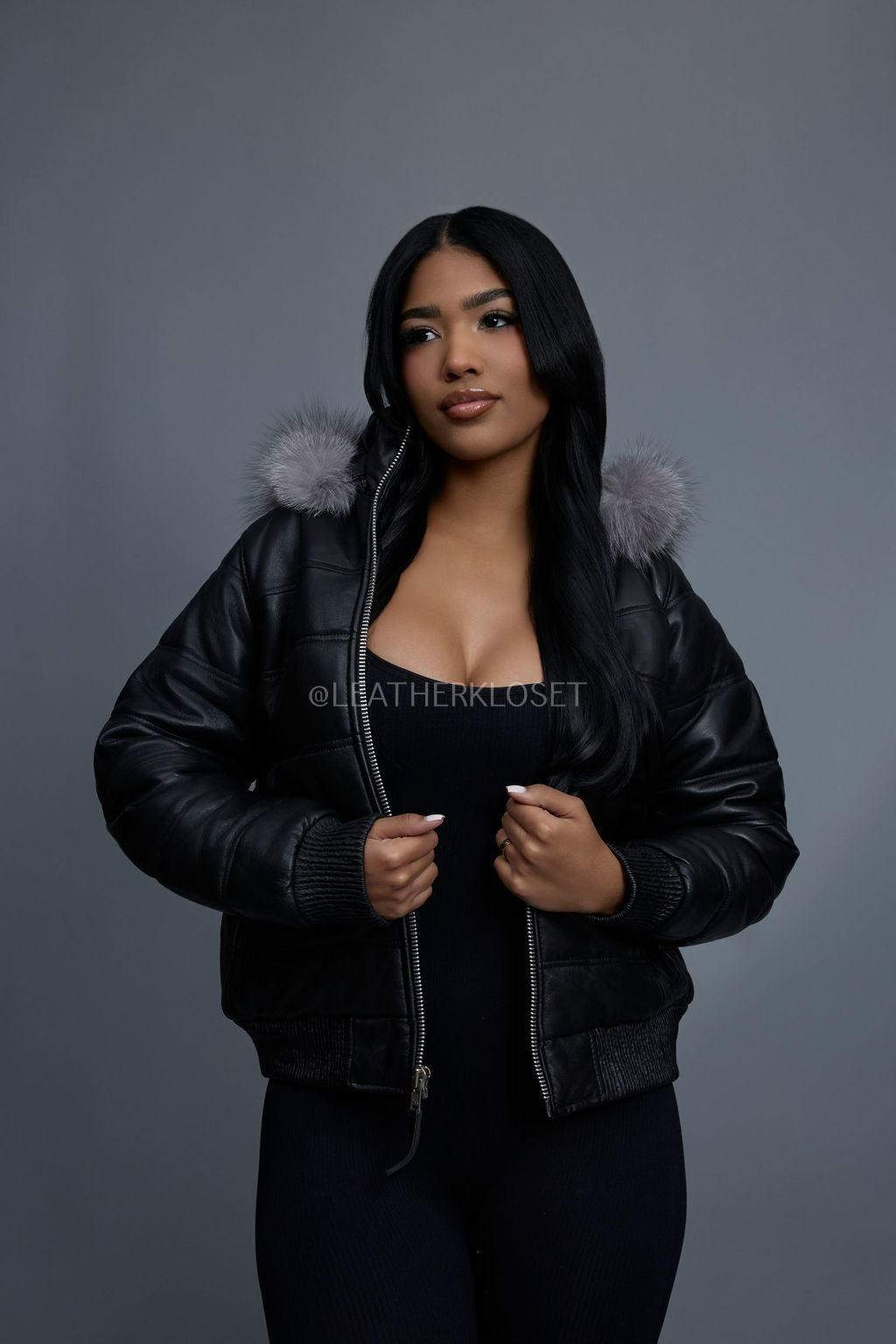 Women's Leather Snorkel Bomber Jacket [Black/Silver Fox]