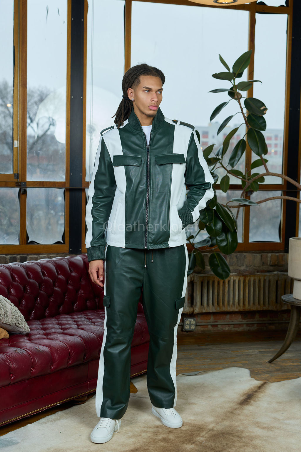 Men's Ace Tracksuit In Lambskin Leather [Forest Green/White]