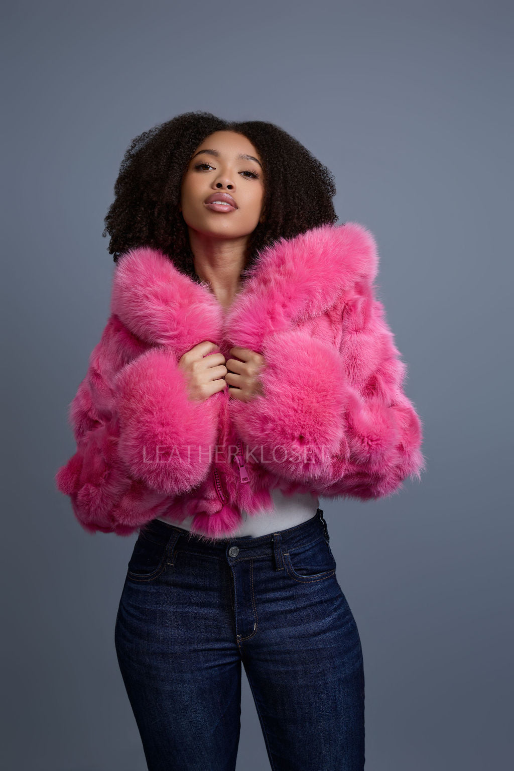 Women's Crop Fox Bomber With Hood [Hot Pink]