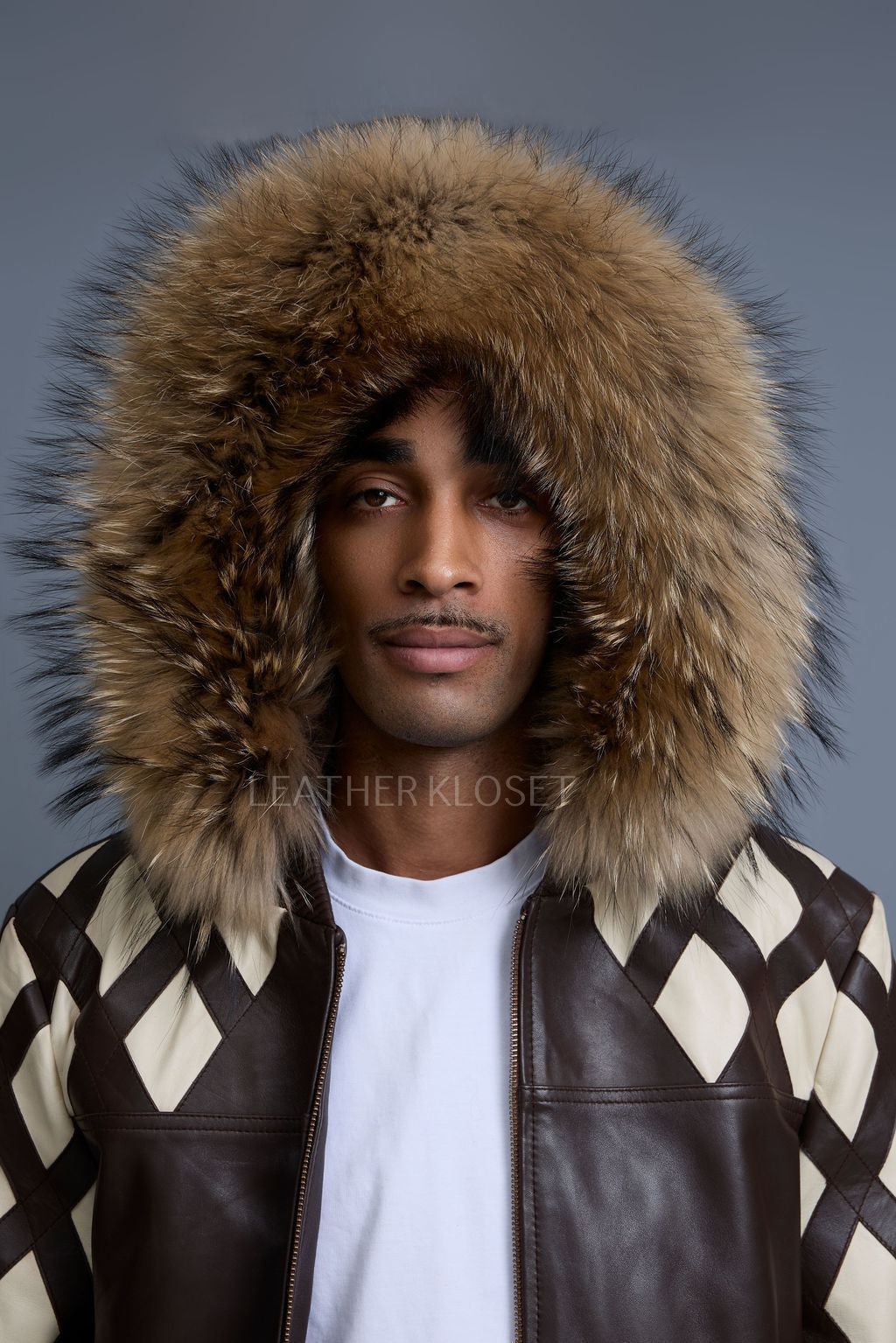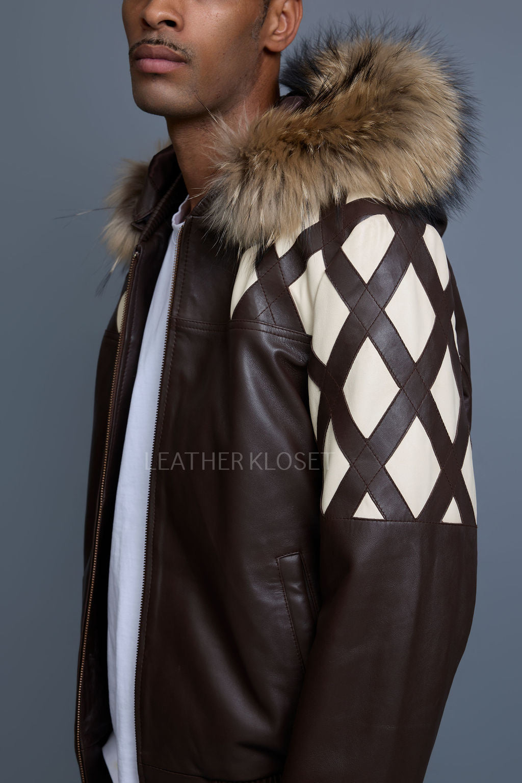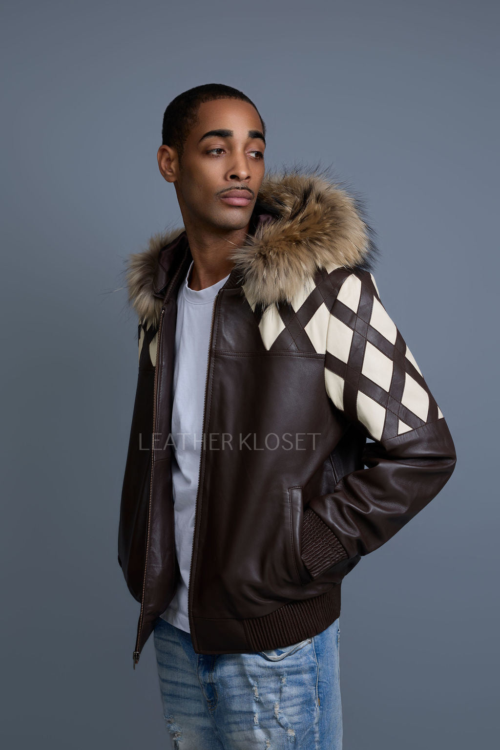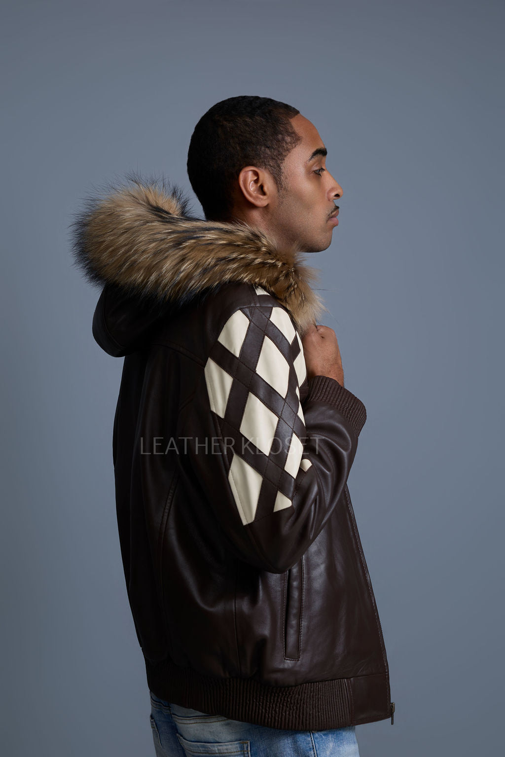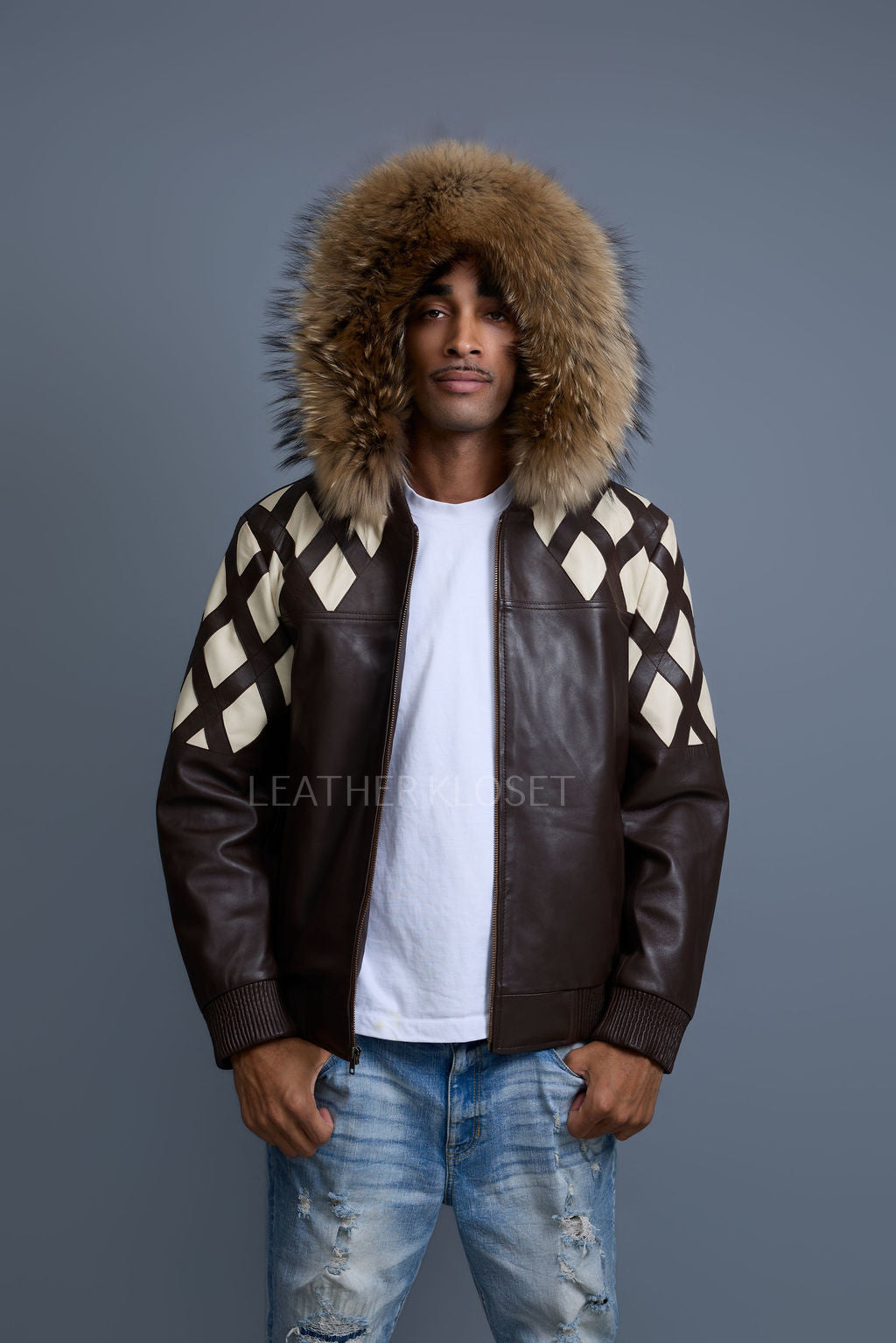 Men's Harlem Leather Bomber Jacket With Raccoon Hood [Chocolate/Beige]