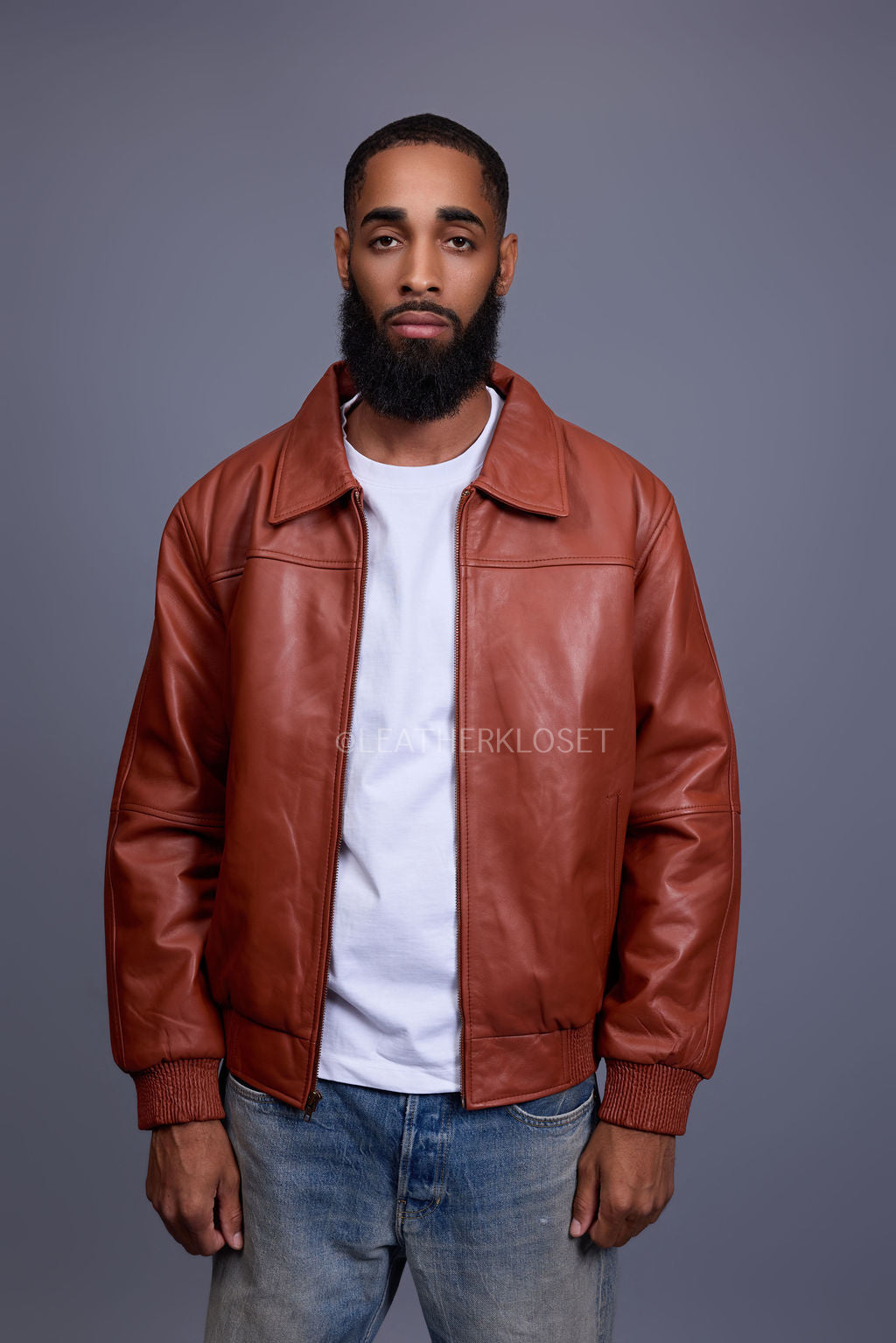 Men's Classic Baseball Leather Jacket With Collar [Rust]