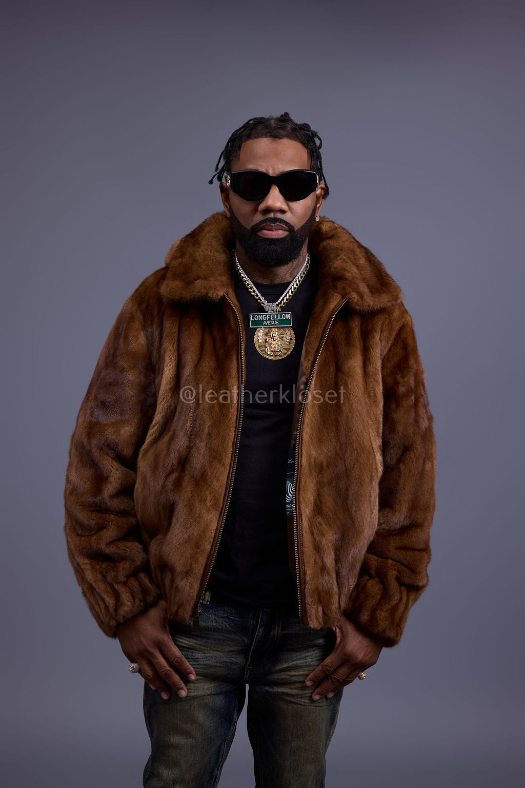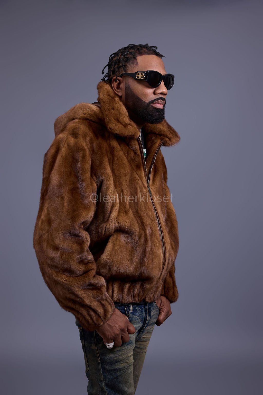 Men's Full-Skin Mink Bomber Jacket With Removable Hood [Whiskey]