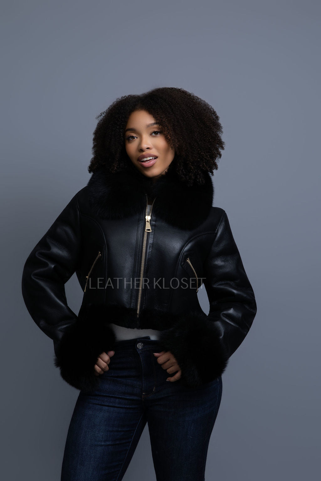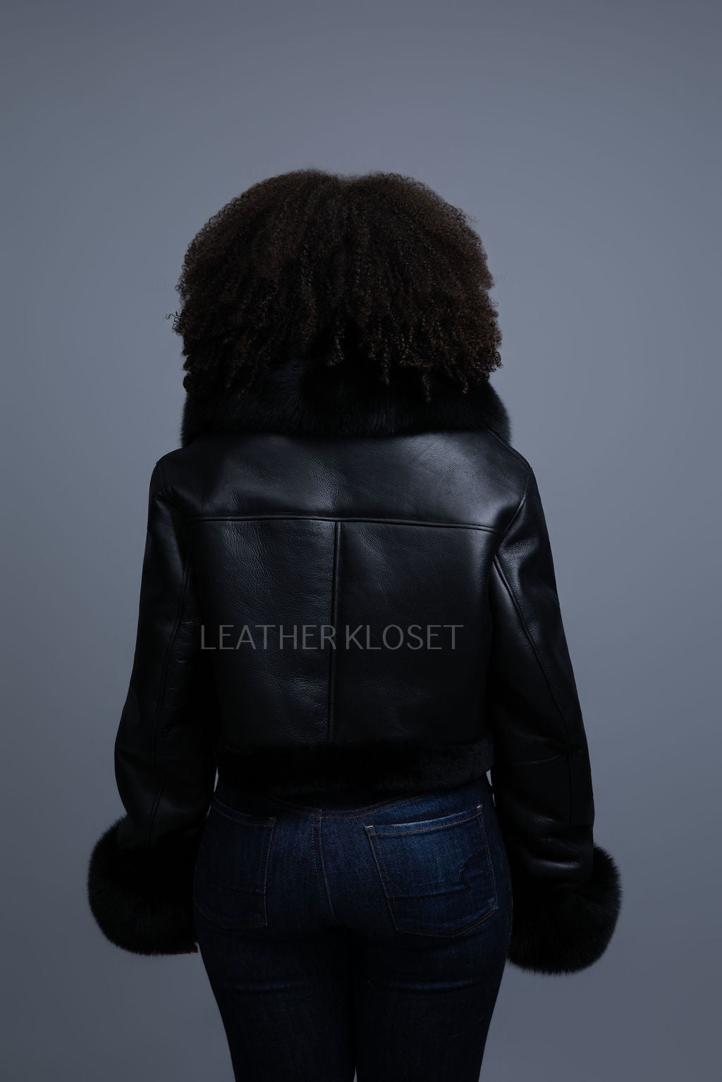Women's Aurora Crop Sheepskin Jacket With Fox [Black/Black]