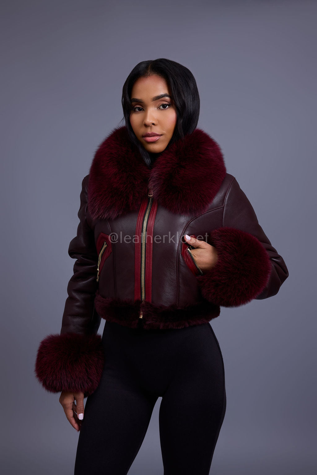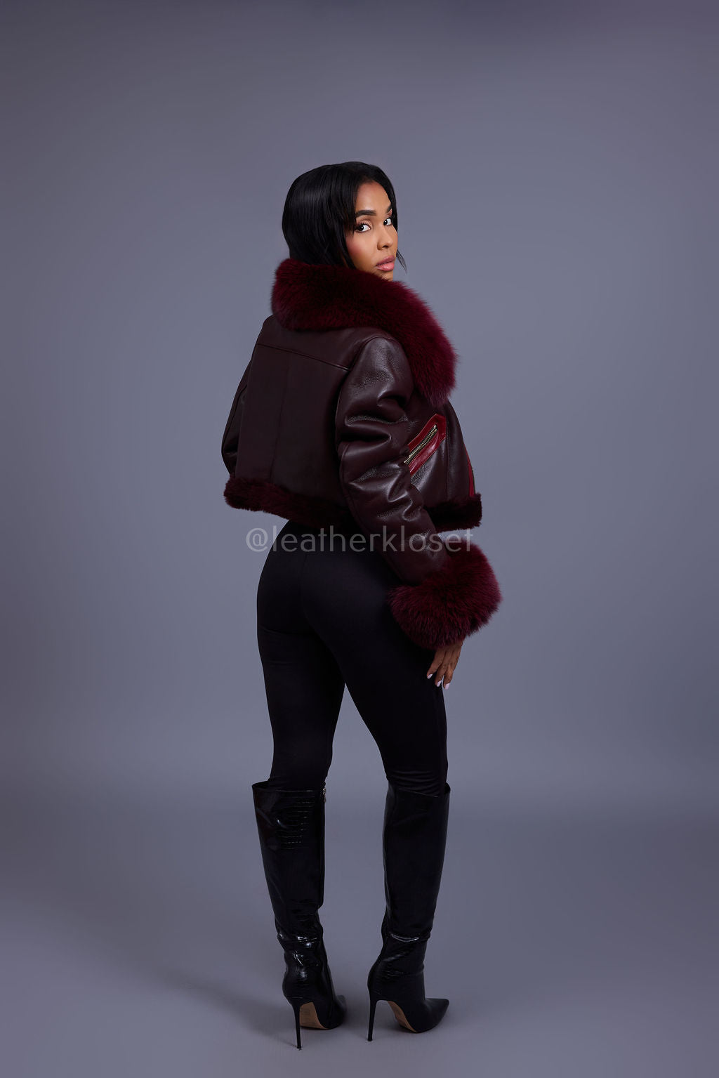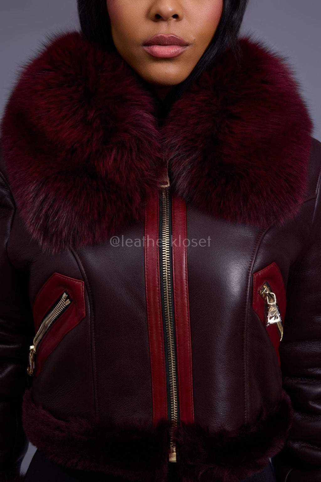 Women's Aurora Crop Sheepskin Jacket With Fox [Burgundy]
