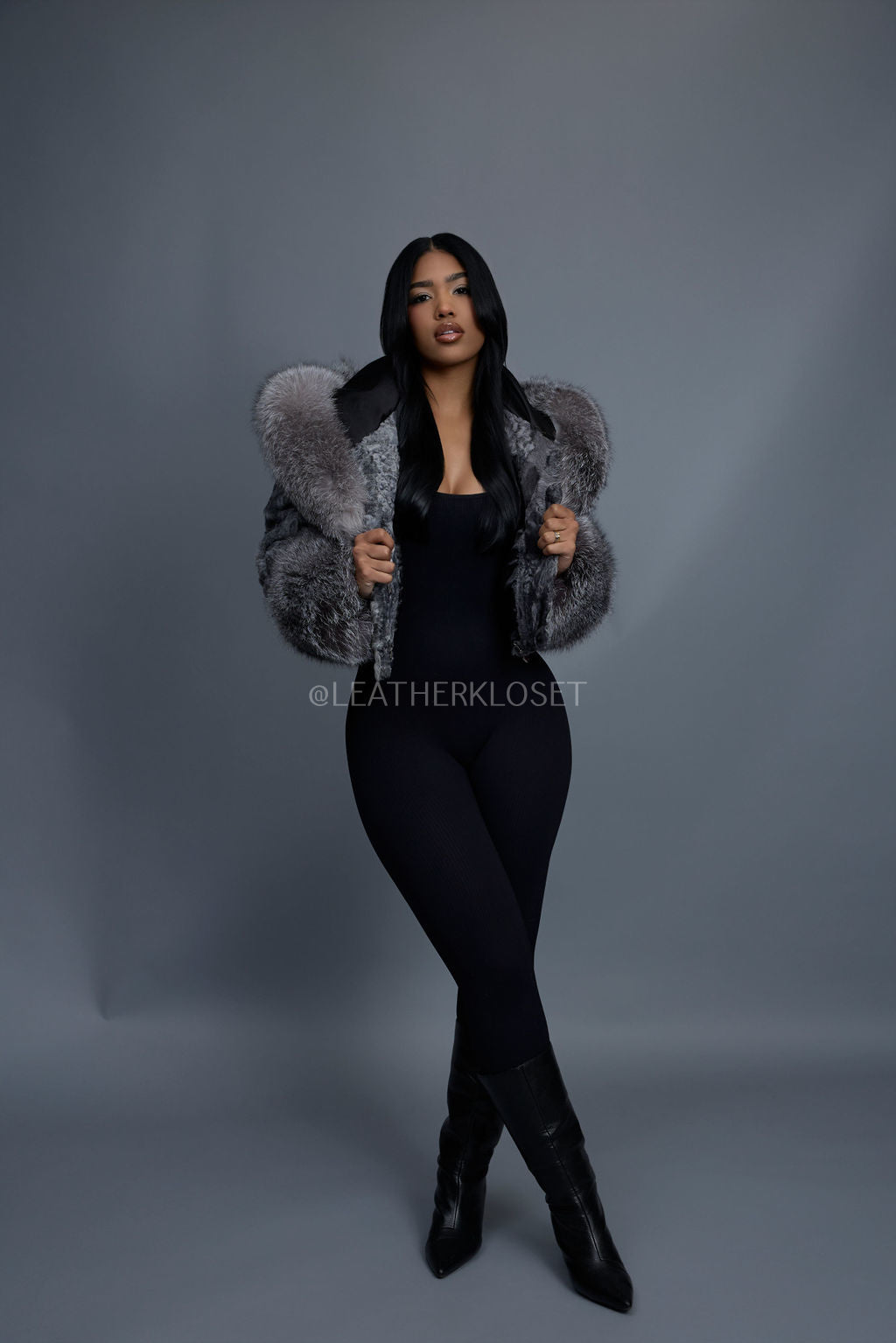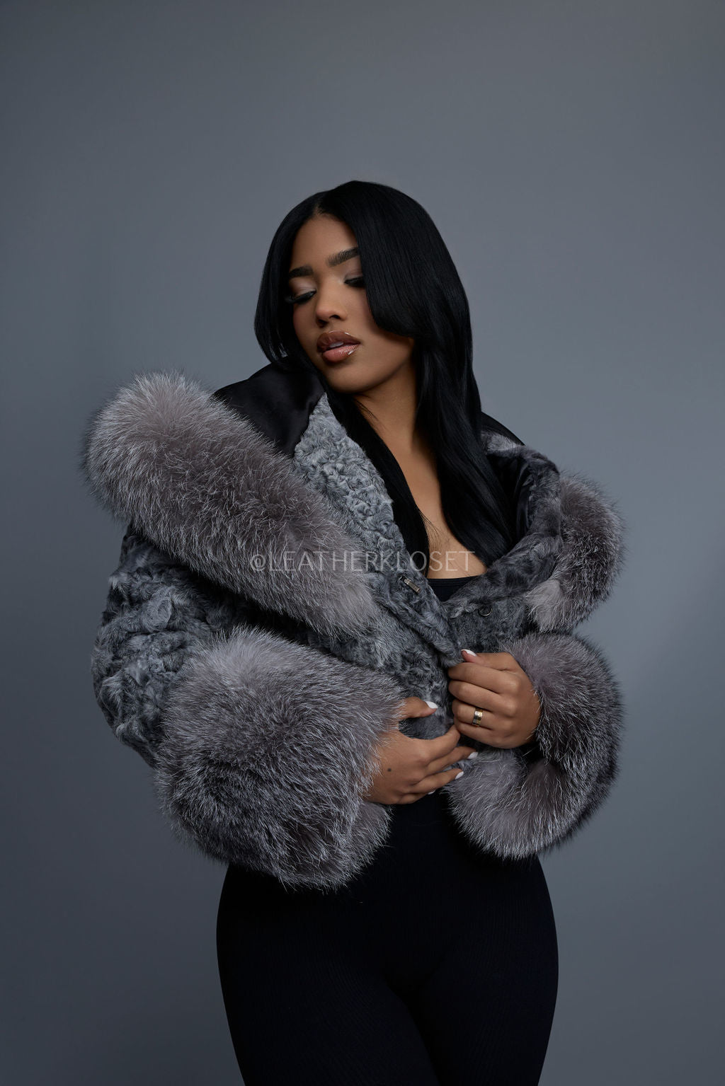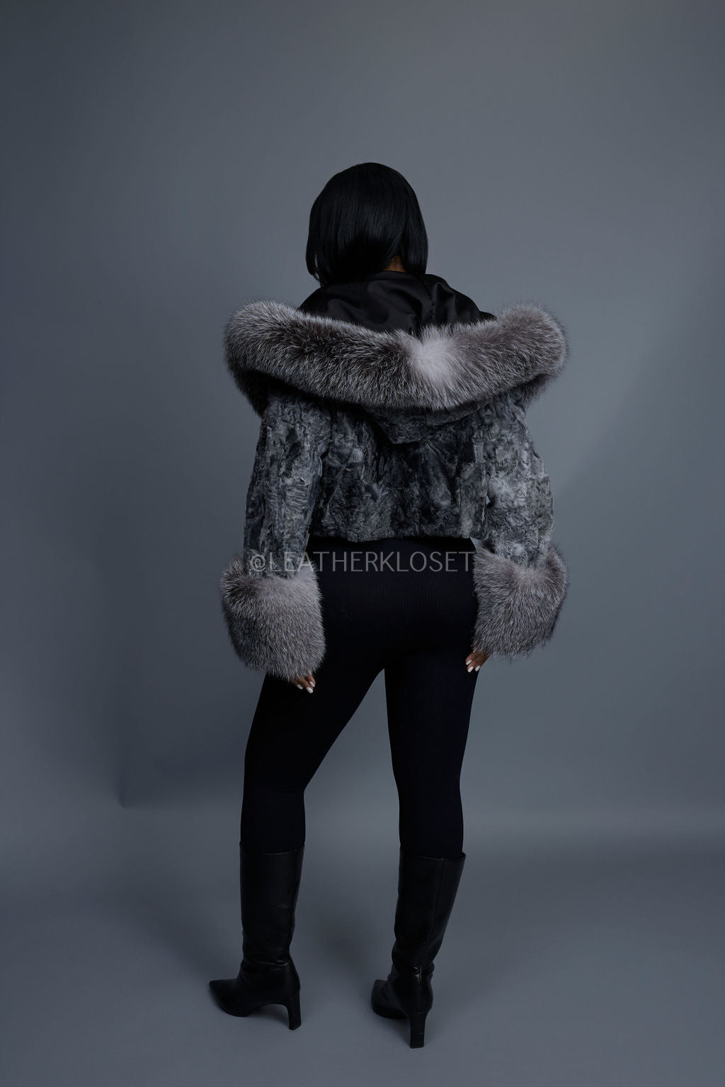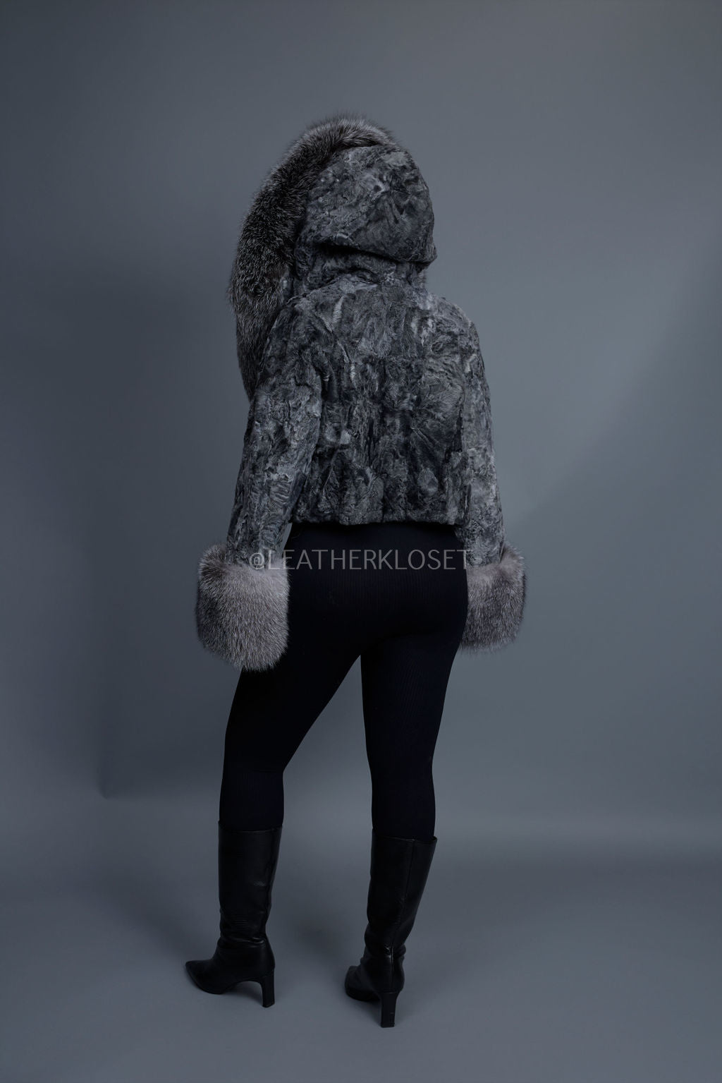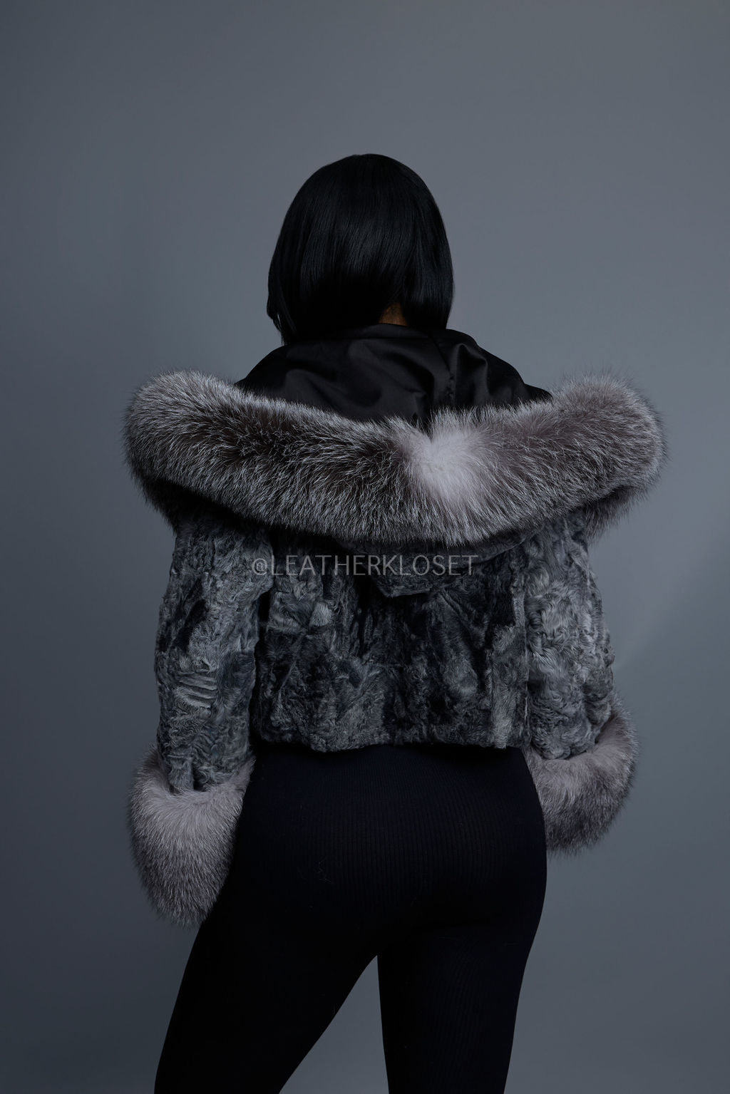 Women's Crop Persian Lamb Cleopatra Bomber With Hood [Grey]