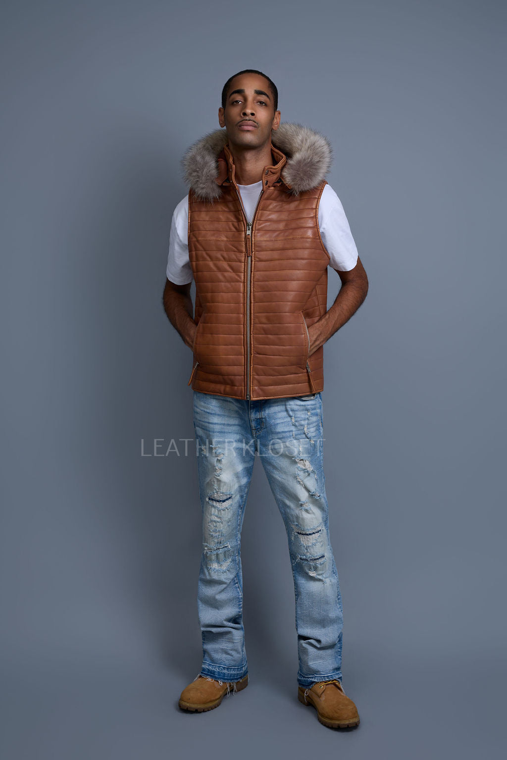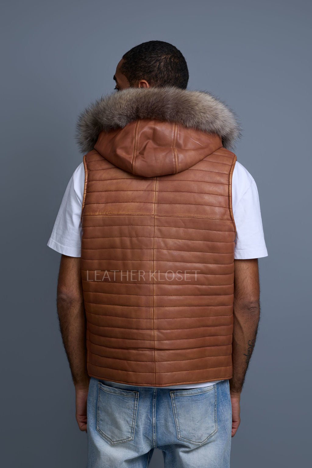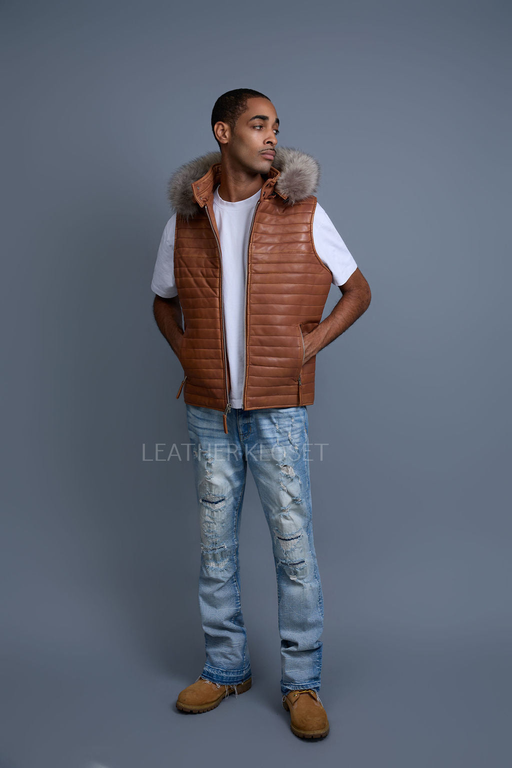 Men's Leather Rowan Vest With Raccoon Fur Hood [Caramel Crunch]